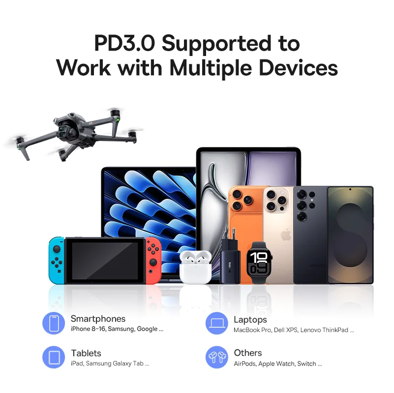 - 46% more compact design than standard 96W chargers for ultimate portability