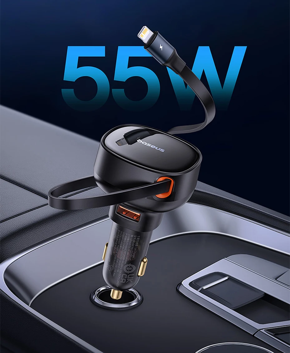 Baseus 55W Car Charger is your ultimate on-the-go power solution, featuring built-in retractable cables for ultimate convenience and a powerful dual-port design. Experience full-range fast charging protocols that deliver a full charge in no time, all while advanced 6-point protection keeps your devices safe. This compact charger is the perfect companion for any vehicle, from sedans to trucks.