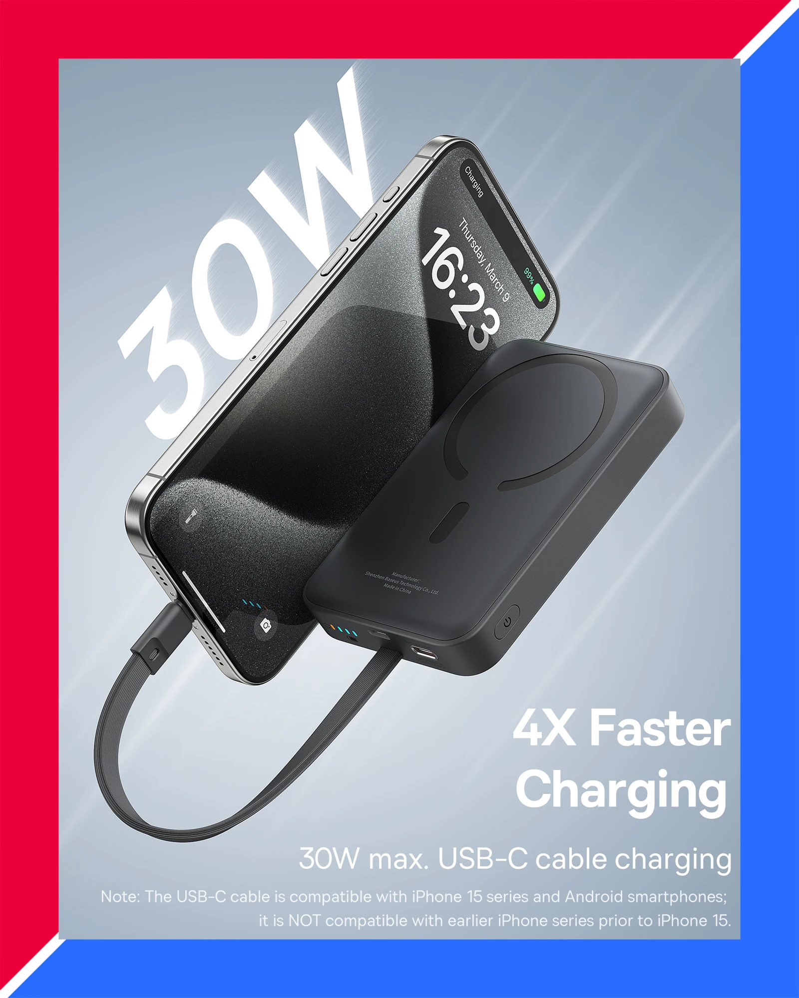 - 2-in-1 design with built-in 30W USB-C cable for ultra-fast wired charging