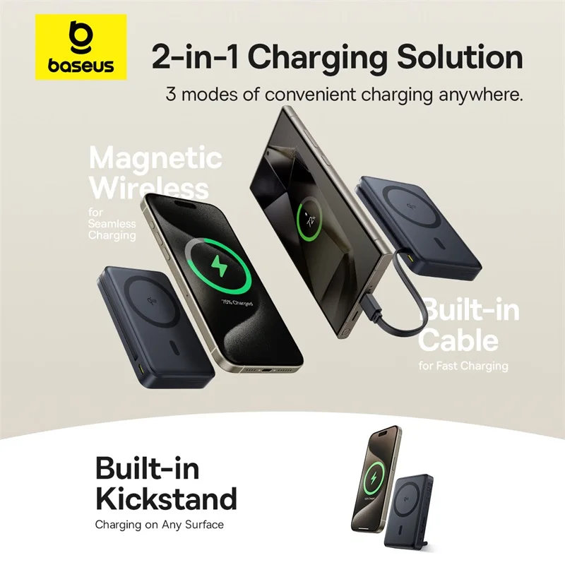 Experience ultimate flexibility and convenience with the Baseus Nomos 3-in-1 Magnetic Power Bank. This sleek gadget features a built-in USB-C cable and powerful 45W output to keep all your devices charged simultaneously. Its portable design and 10,000mAh capacity ensure you have all-day power ready wherever you go.