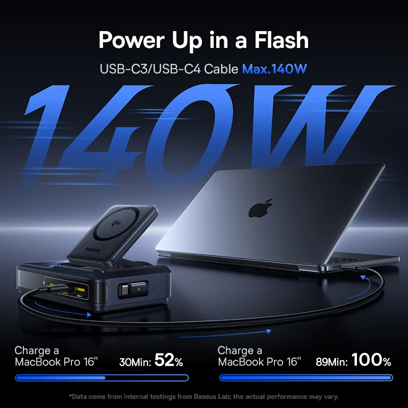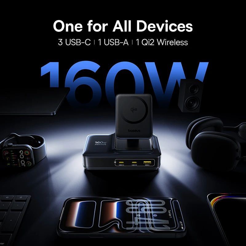 Baseus Nomos NH21 Desktop Charging Station. This all-in-one power hub delivers 160W total output to charge up to 5 devices simultaneously while keeping your workspace organized and cable-free. Featuring advanced GaN technology and Qi2 wireless charging, it’s the ultimate charging solution for your entire device ecosystem.